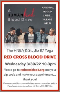 The next blood drive will be Wednesday March 30 between 10-3 at Studio 87 Yoga. Thank you to Donna and all the volunteers who make these blood drives happen!