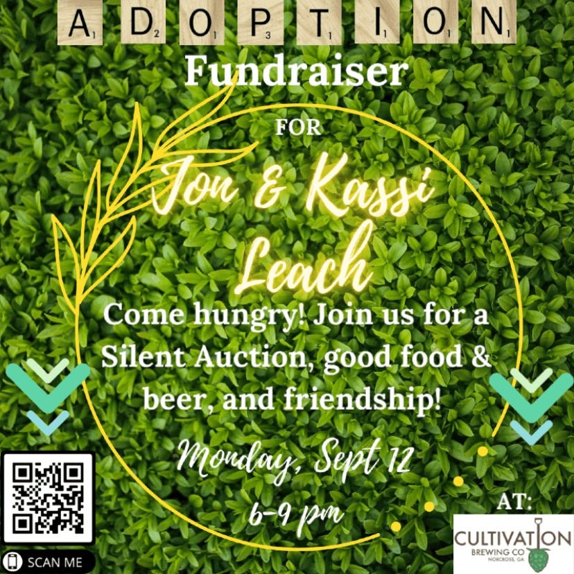 Support the Leach’s adoption fund at Cultivation on Monday September 12. Jon and Kassi just passed the home study and are in the process of getting matched. All are welcome!