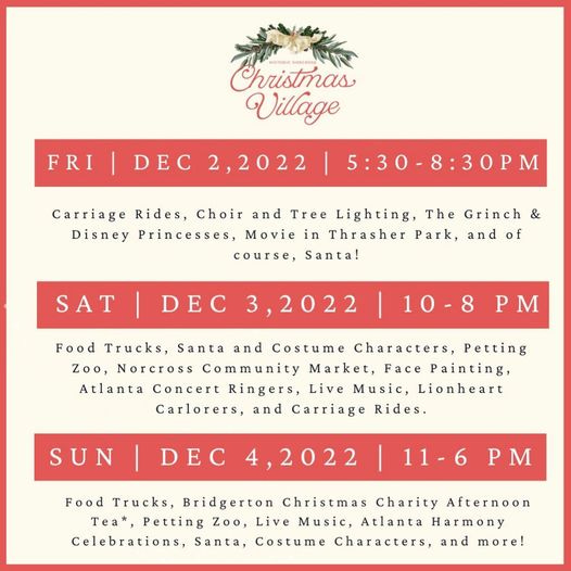 Festivities for the annual Historic Norcross Christmas Village begin today, December 2 through Sunday, December 4! The weekend has something fun for everyone - and Historic Norcross is so beautiful this time of year!